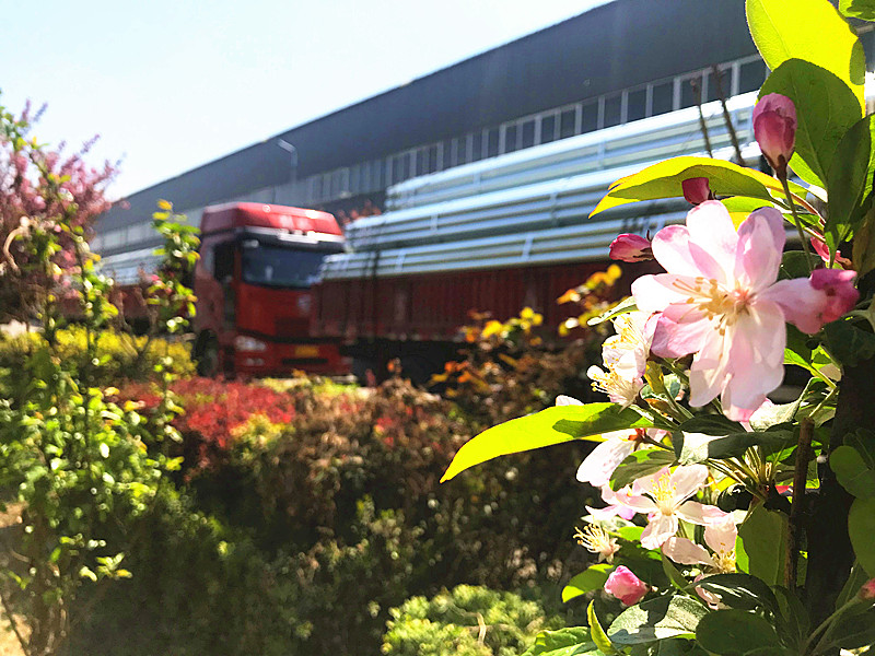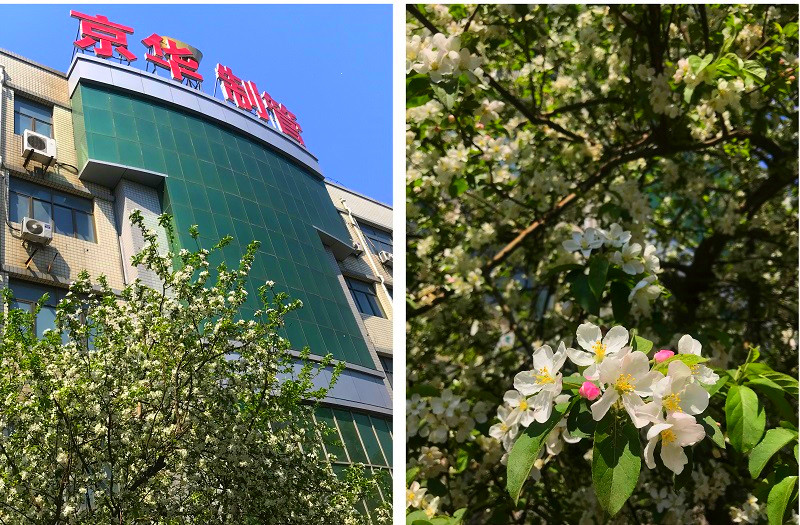 一树树榆叶梅,灿烂多姿,清香宜人,在晨露里含笑绽放,在春风里摇摆着娇媚的身姿。京华厂区里的海棠高低错落、疏密有致。