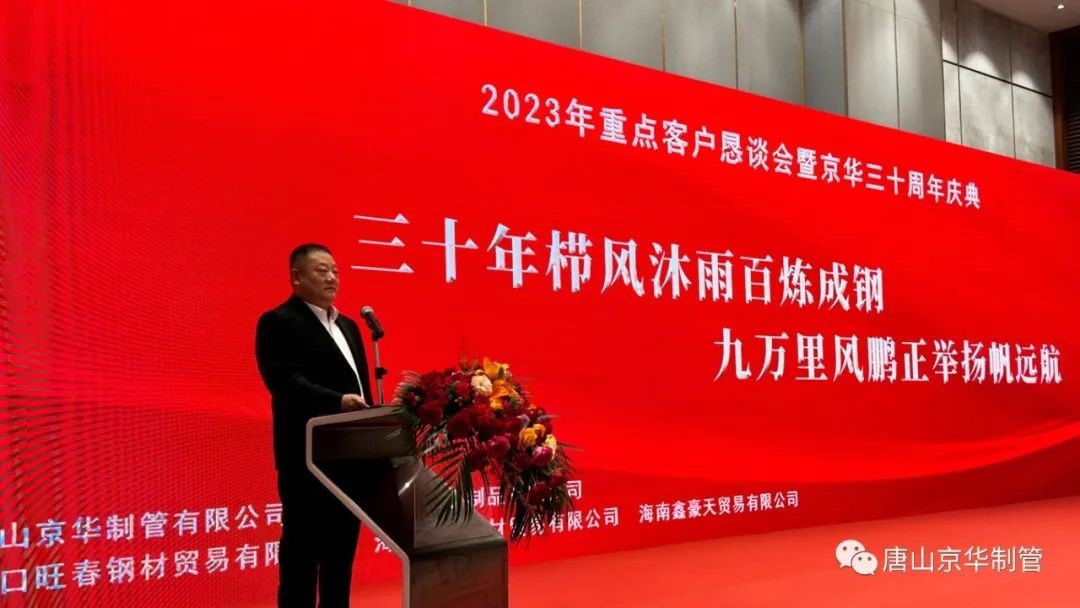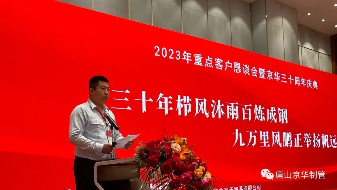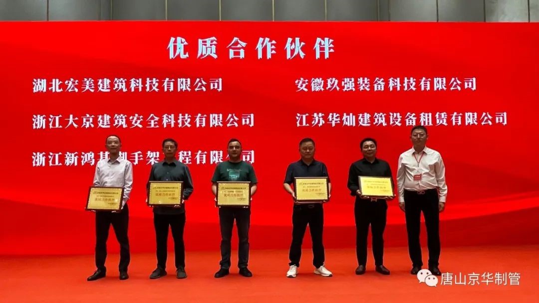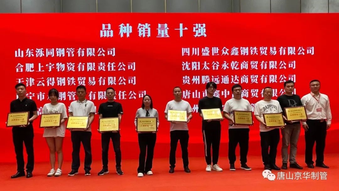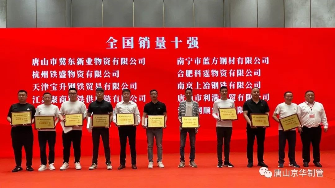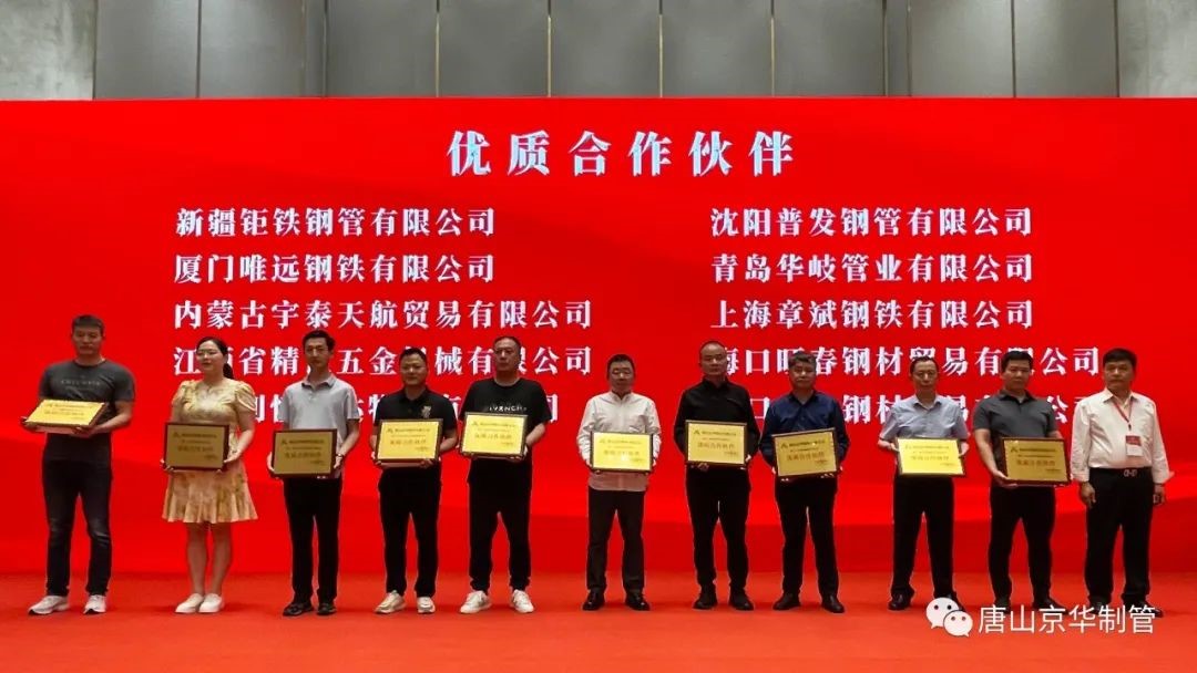 会上,公司向唐山市冀东新业物资有限公司等10家单位颁发了唐山京华“2022年度全国销量十强”,向山东泺同钢管有限公司等10家单位颁发了唐山京华“2022年度品种销量十强”,向新疆钜铁钢管有限公司等10家单位颁发了唐山京华“2022年度优质合作伙伴”,向湖北宏美建筑科技有限公司等5家单位颁发了济南京华“2022年度优质合作伙伴”奖项。